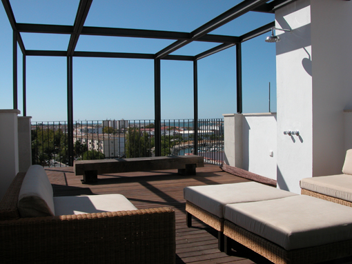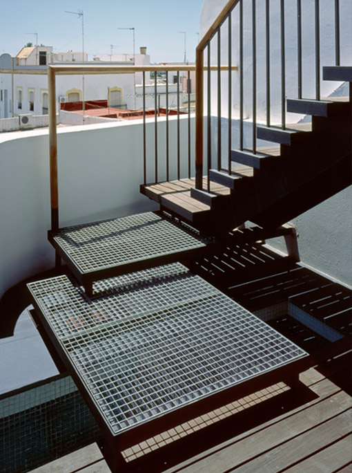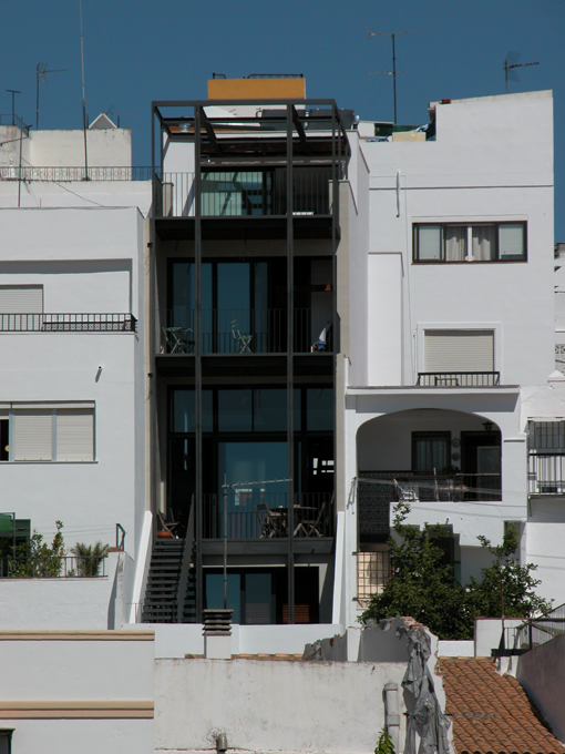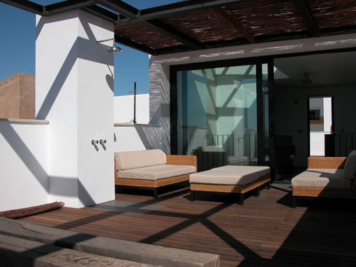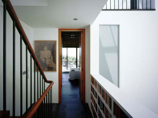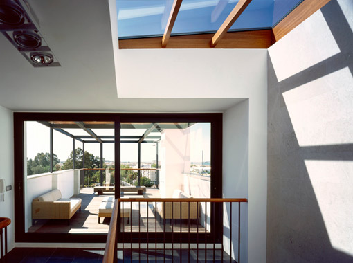 A solution was to incorporate a sun-screening structure on the south (rear) side with deep balconies to each floor. The house can be further screened by the use of solar blinds set within the face of the structure which allow views out but protect against the sun.