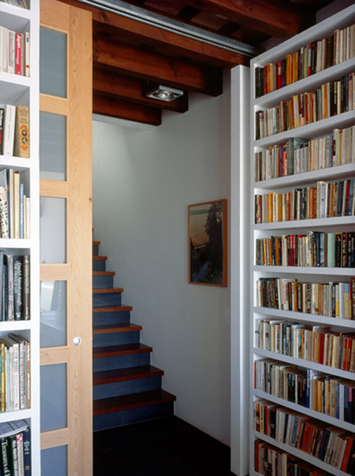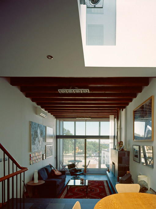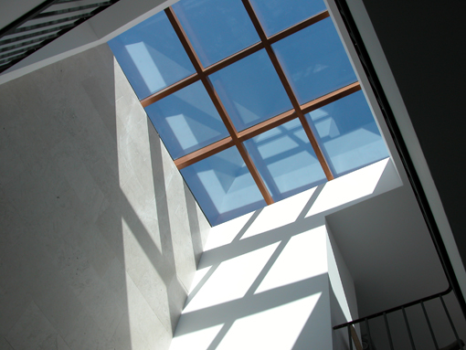 The central lightwell brings light right down into the heart of the house (the dining section of the open plan living/dining/kitchen space which forms the ground floor accommodation), and gives light via white glass panels into internal bathrooms at first floor level. It also acts as a natural chimney allowing warm air to rise to the top of the house where it is exhausted and thus causes the natural circulation of air from the basement to second floor level creating pleasant draughts in the summer. In the winter the lightwell has the opposite effect with warmth created through the large glass rooflight at the top which can be screened in the hot summer months.