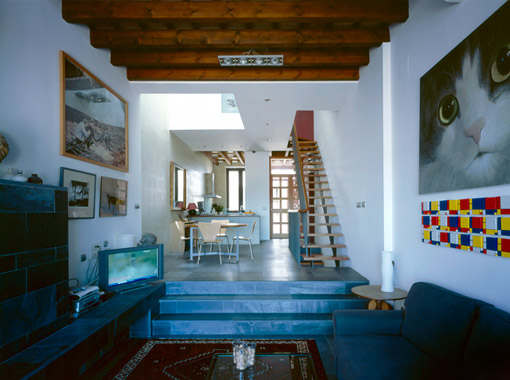 A long, narrow, south-facing site in the town centre with a 4.5 metre drop from street level to the rear boundary, presented several problems in creating a family house with lots of light but without the inherent solar heat gain problems.