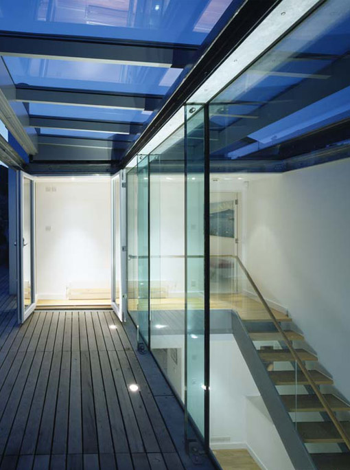 A sliding glass roof over the double height living room creates the effect of an internal courtyard with light penetrating to all corners. The sliding rooflight also provides a canopy, when open, to an alfresco dining space on the newly created roof terrace. The windows were all replaced using galvanized steel frames and lintels evocative of the more recent, light industrial use of the mews.