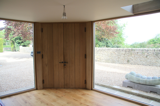 The design ethos was to use a combination of the traditional materials used in the original building (green oak framing, dressed portland stone, lime-washed render etc) but used in a 21st century way and combined with large double-glazed openings set in oak frames and with a sold oak front door.